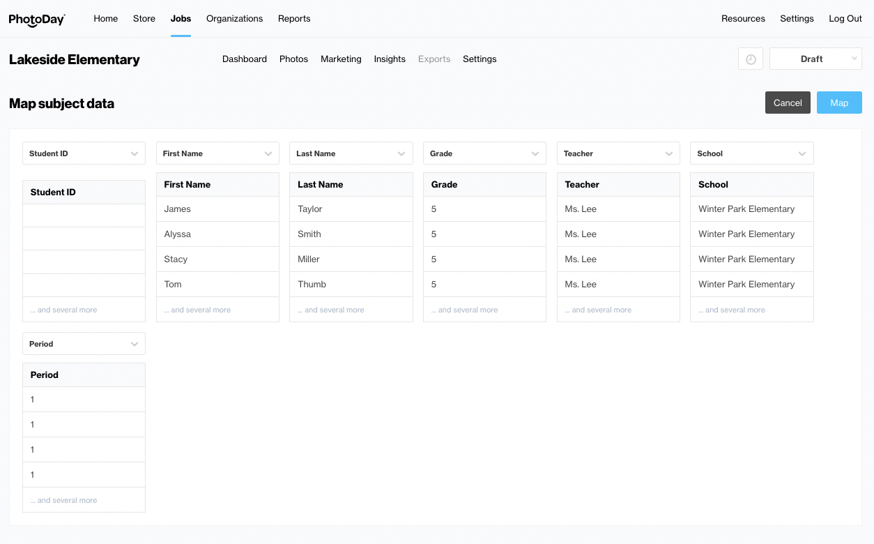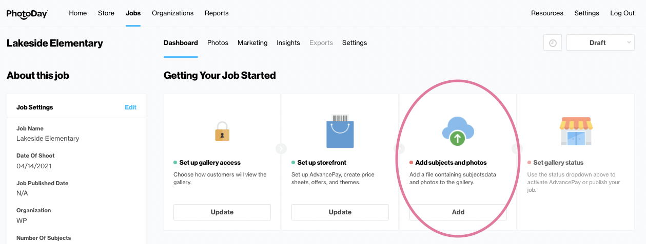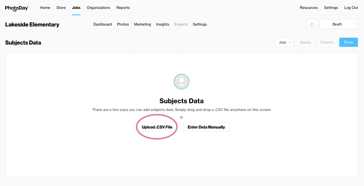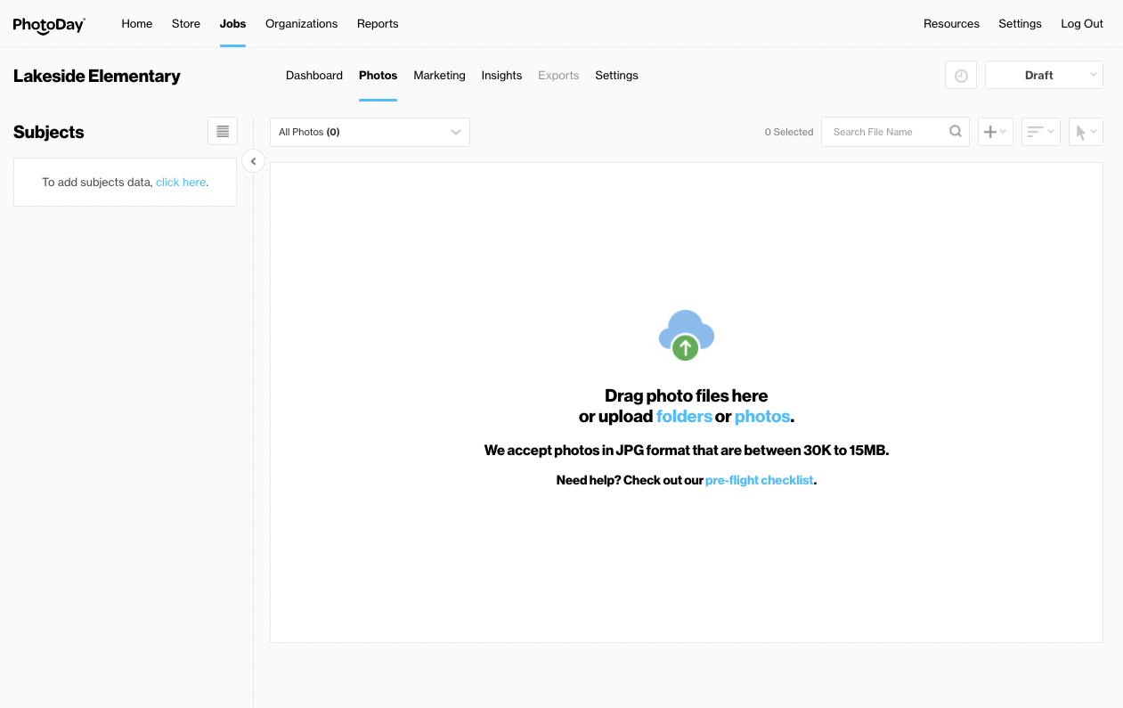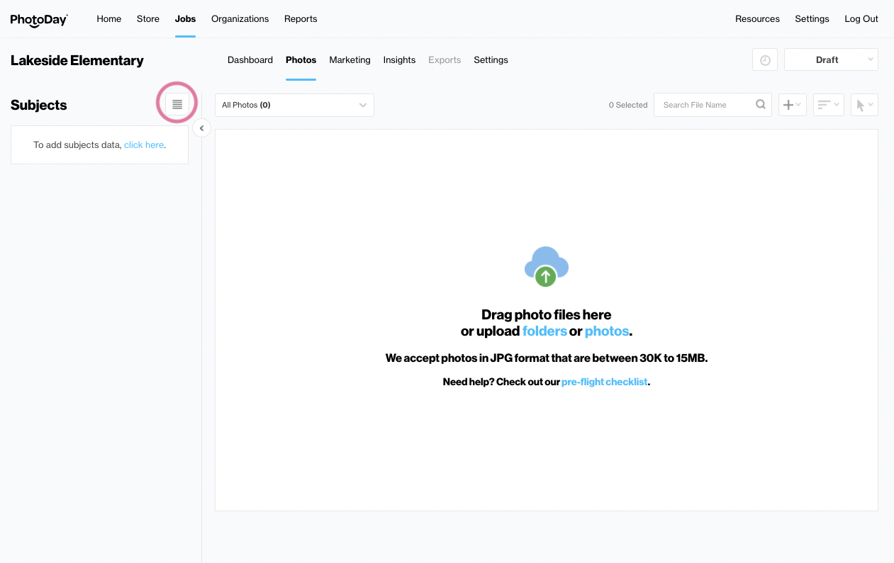 Adding photos to a private gallery is a two-step process. Since private galleries give each person their own private sub-gallery, your job needs to keep track of information of each person within it. PhotoDay calls this information “subject data”, and it can be batch uploaded via a CSV file right into your job.