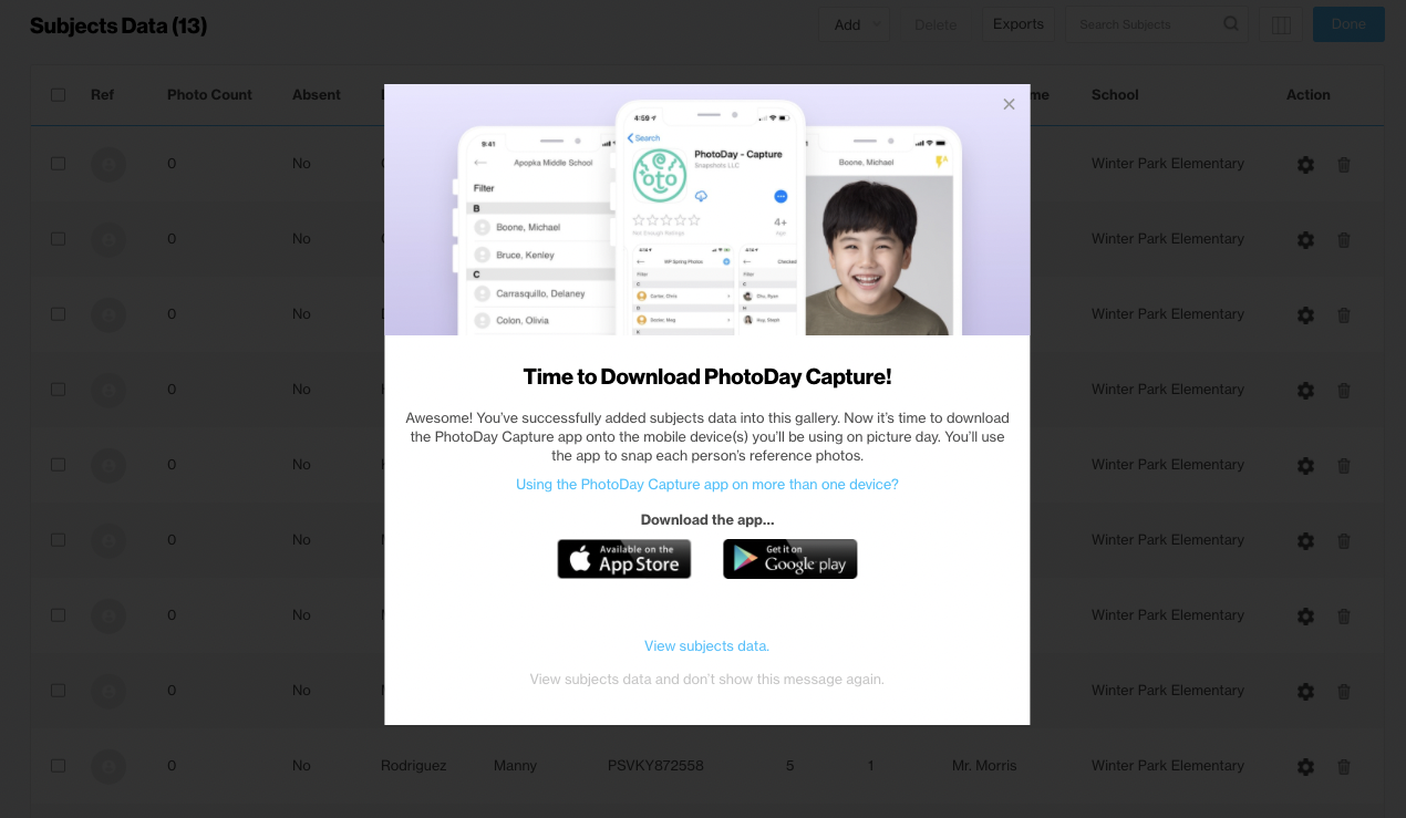 Congratulations! Your people data has been officially added to your job. Now, it is time to use the PhotoDay Capture mobile app to capture your reference photos, which will automatically sync with your subject data in the gallery.