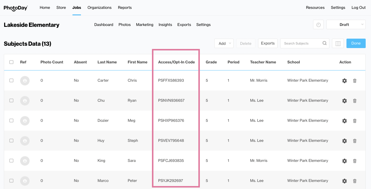 In addition, you will also see that each individual subject in your data has been assigned a unique access code. This is the code your customers will use to find the exact photos for which they are looking for.