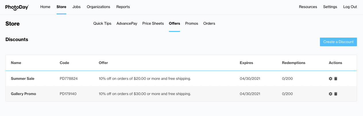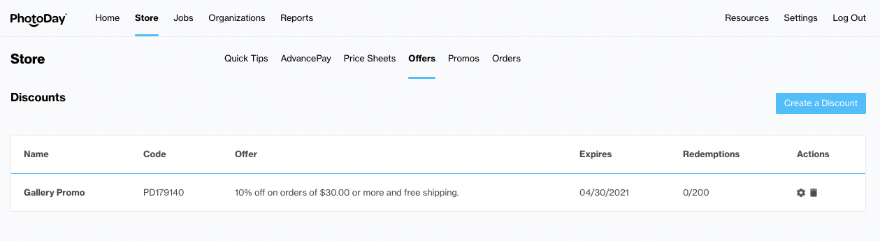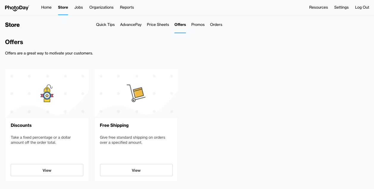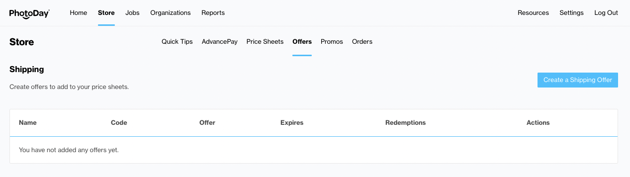 Everyone likes a good deal, right? They’re a great way to motivate your customers to purchase more, and purchase now! This is why we’ve included a way for you to create these incentives within PhotoDay in the form of the Offers section. While creating offers is entirely optional, it’s a great way to help you close more sales. From your Store section, click on the Offers icon to begin creating your first offer.