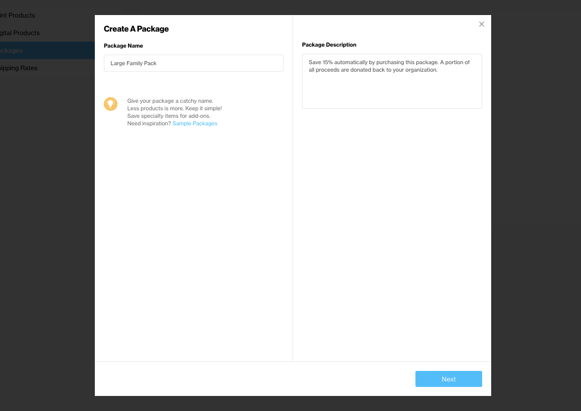 Here, you will be required to give your package a name. This name will be visible to customers, so you want to make it descriptive, yet catchy! You will also need to fill in a short description, which will also be visible to the customer - be sure to highlight the percentage savings off the individual prices of the products included in the package to create a powerful incentive.