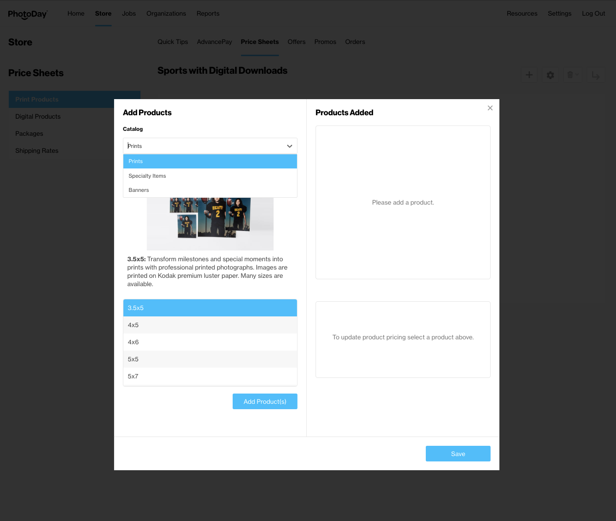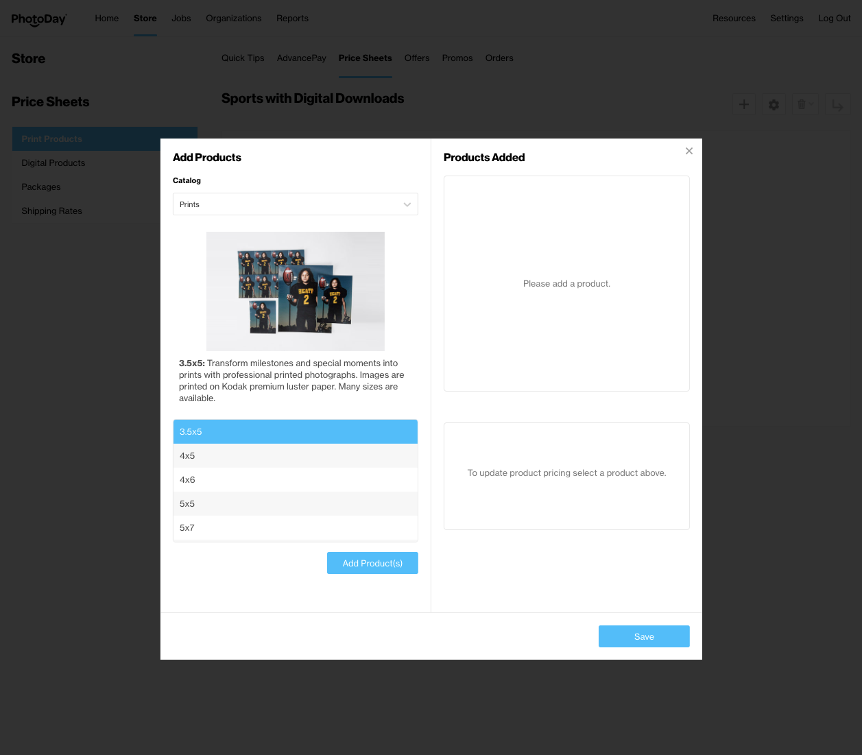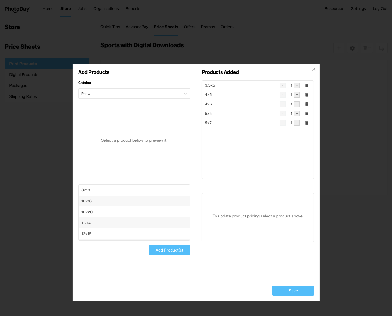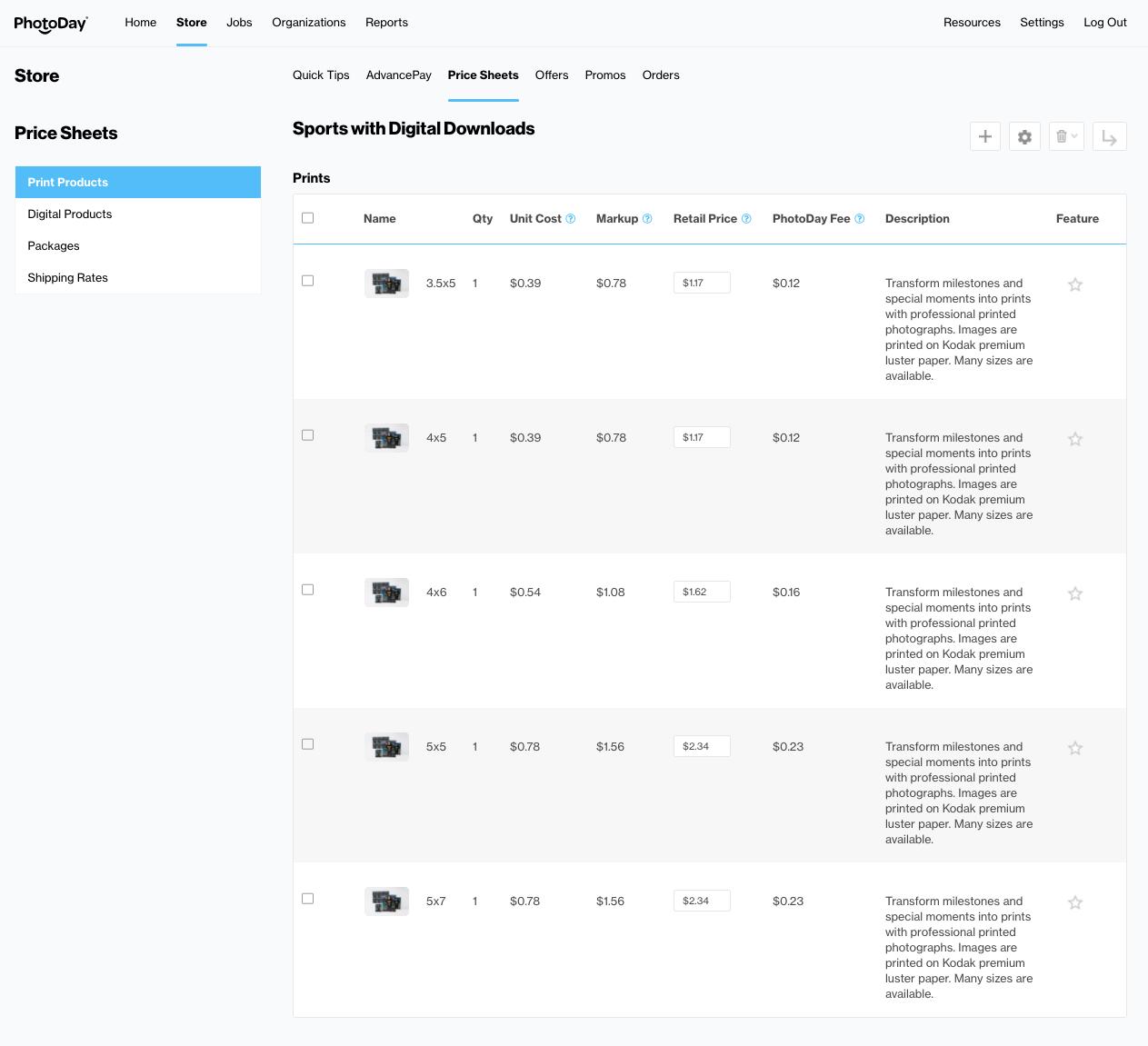 Once a package is constructed and priced accordingly, click the Save button to add that package to your price sheet. Please note, just like products, packages can be moved around in any order to customize the way it is viewed to your customer. Once a price sheet is attached to a job (we’ll show you how to do that in just a bit), the a la carte items and packages will be reflected on the customer-facing view of the storefront.