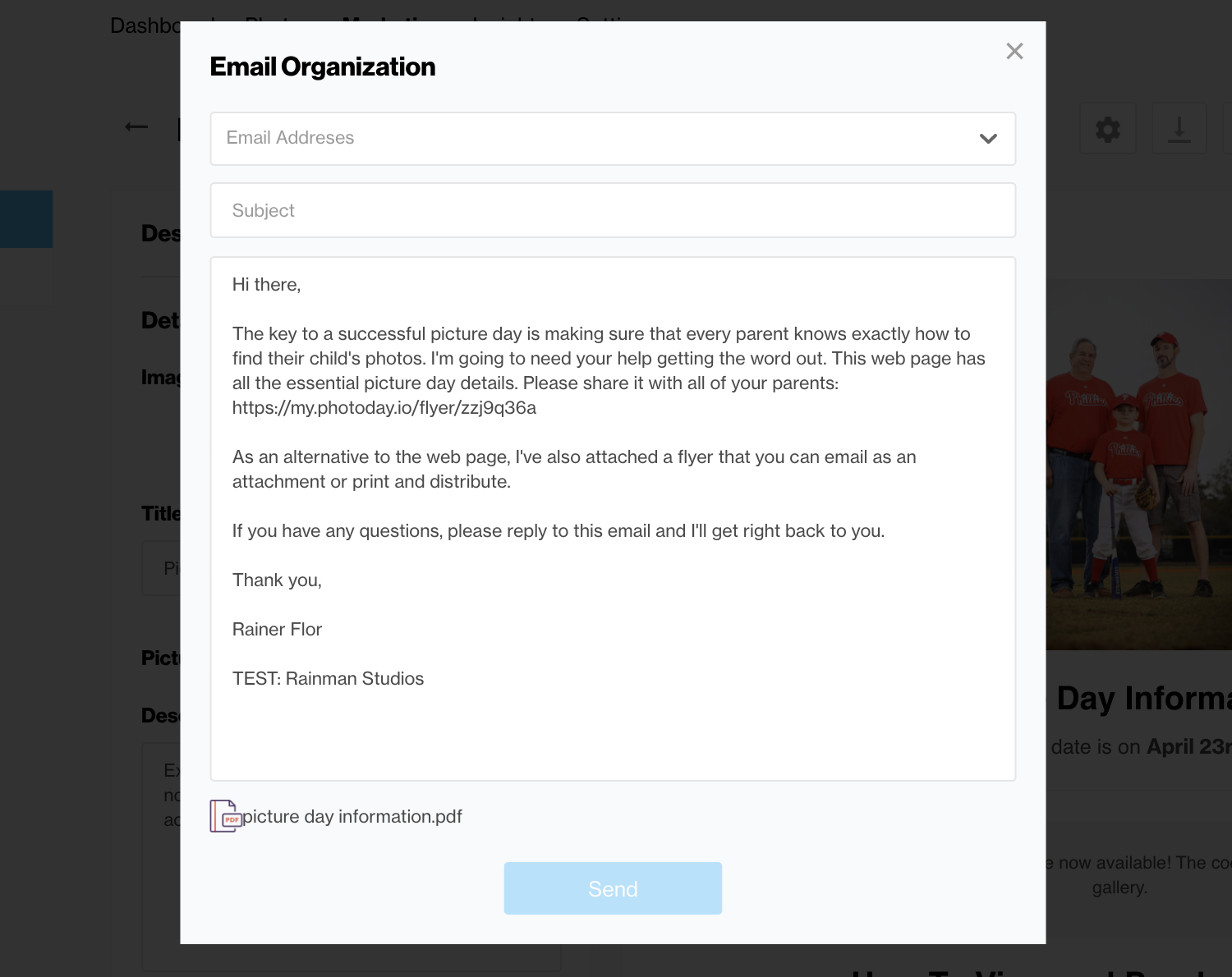 PhotoDay provides a built-in solution for promoting your galleries to your customers via flyers. Flyers are great way to promote and get the word out about both photos and picture day itself through print, email or as an HTML link. Flyers include useful details that will help guide your potential customers to the gallery, where they can find and purchase their photos with ease.