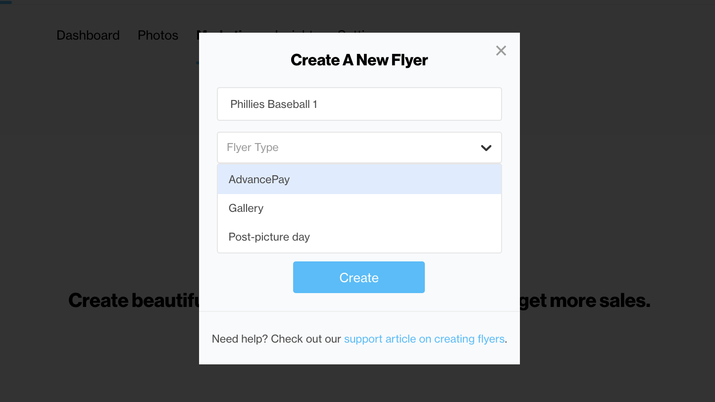 In order to begin creating a flyer, navigate to the Marketing section within your gallery.